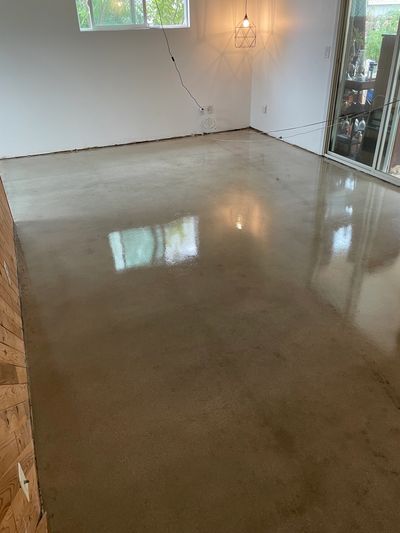 Our first step is to inspect your concrete and set expectations for the outcome. Some floors will have patterns or holes from previous flooring like tile or carpet. Tile flooring will leave a hydration pattern where the grout lines were, which we refer to as ghosting. Carpeted floors will have holes where the tack strips were located. Although we can't do anything with the ghosting, we can fill the tack strip holes.